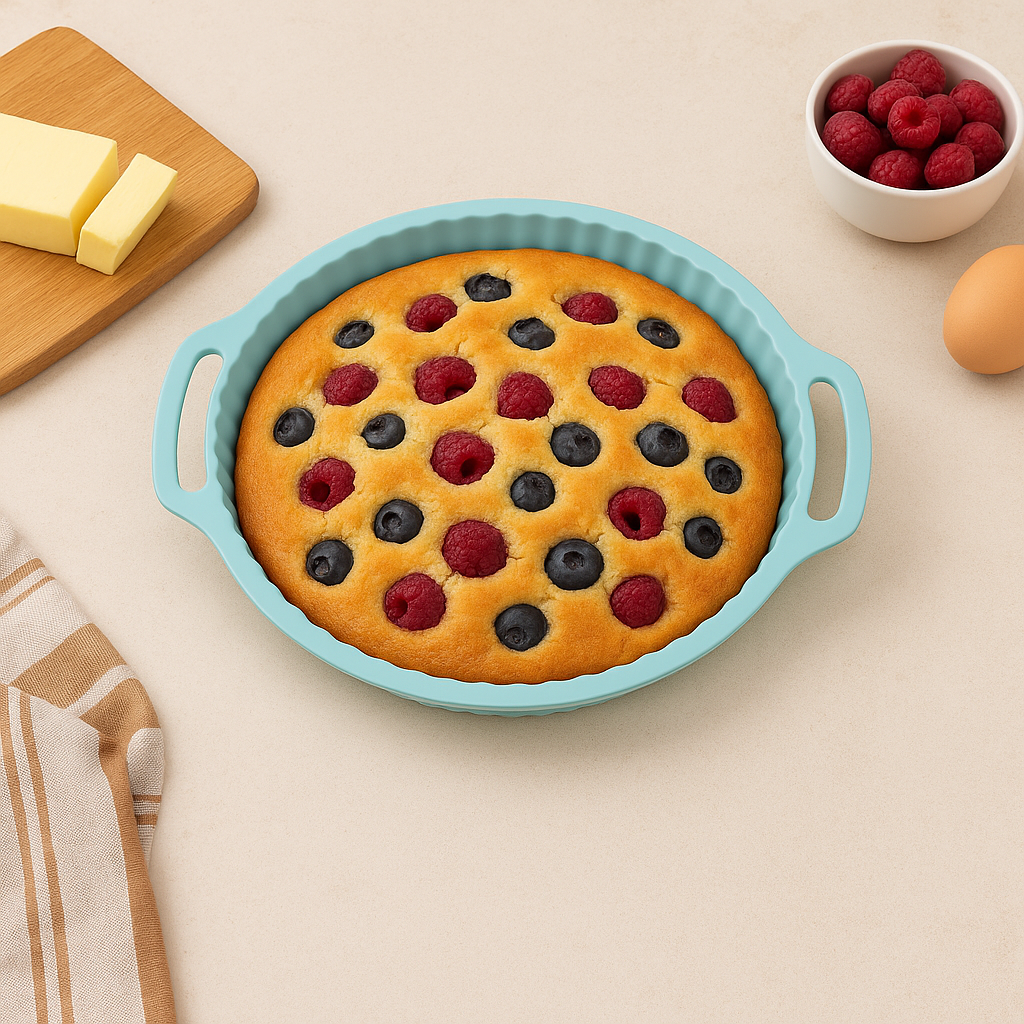 Tavă rotundă din silicon alimentar antiaderent, ideală pentru tarte, quiche și deserturi. Rezistentă la temperaturi înalte, ușor de manevrat și curățat.
