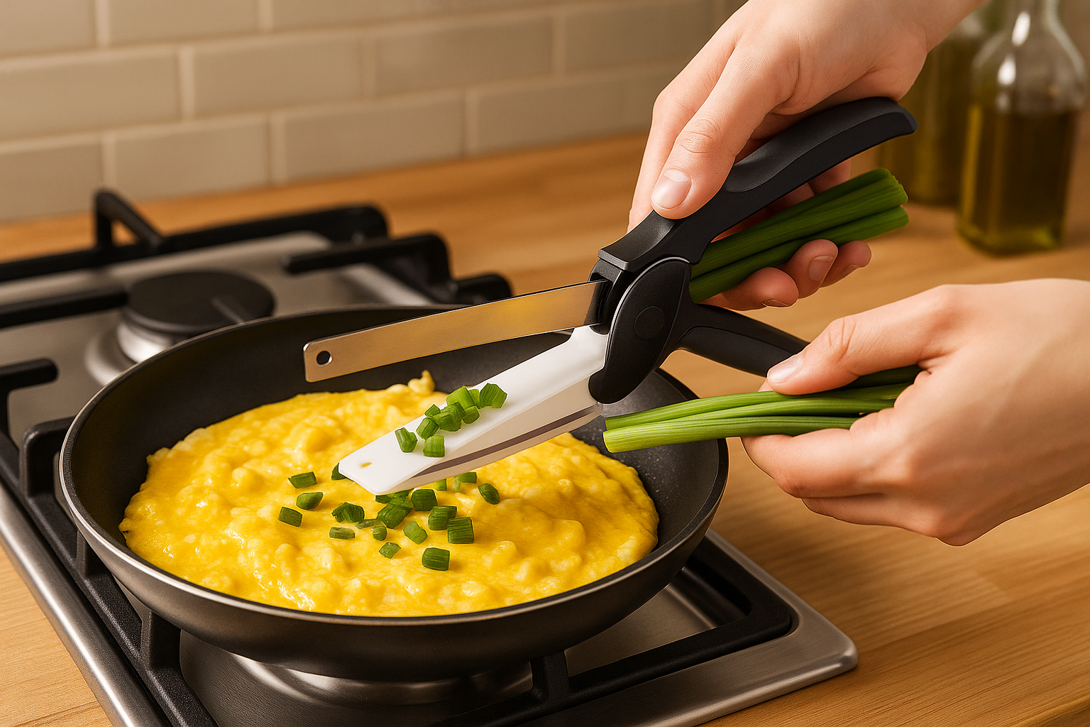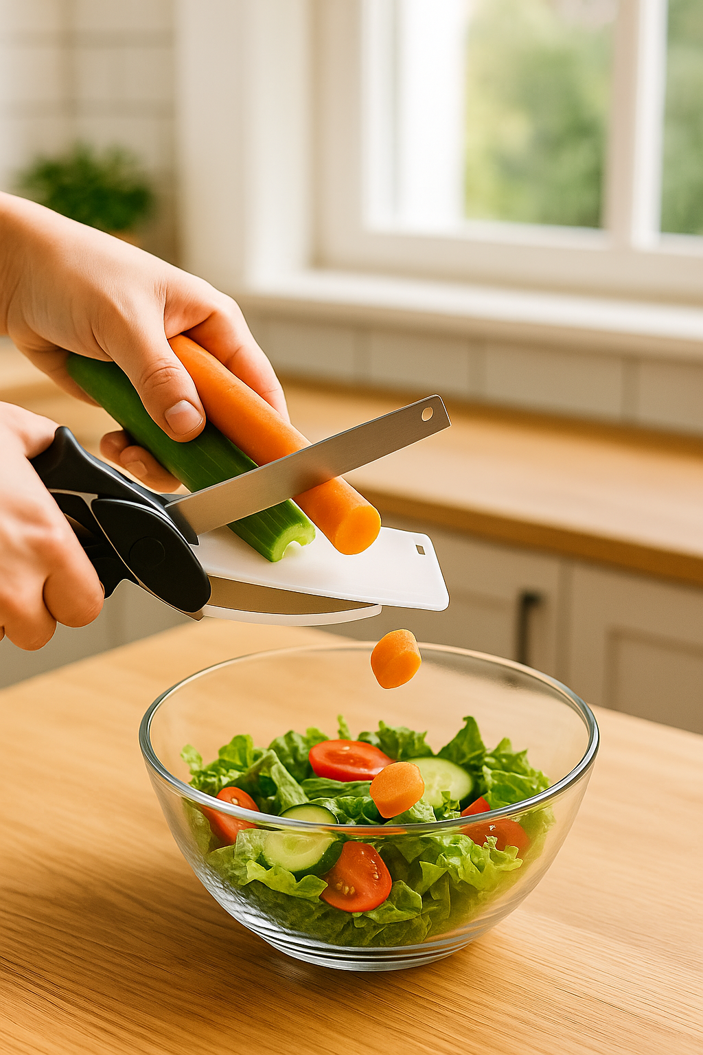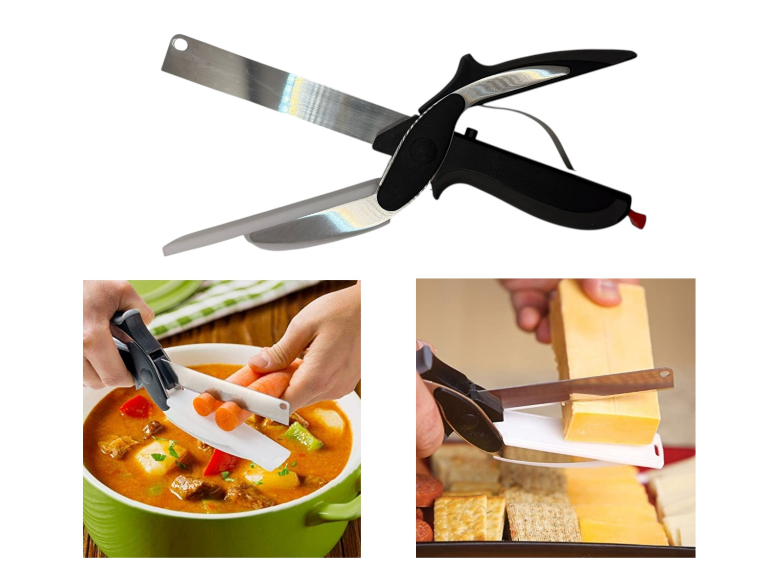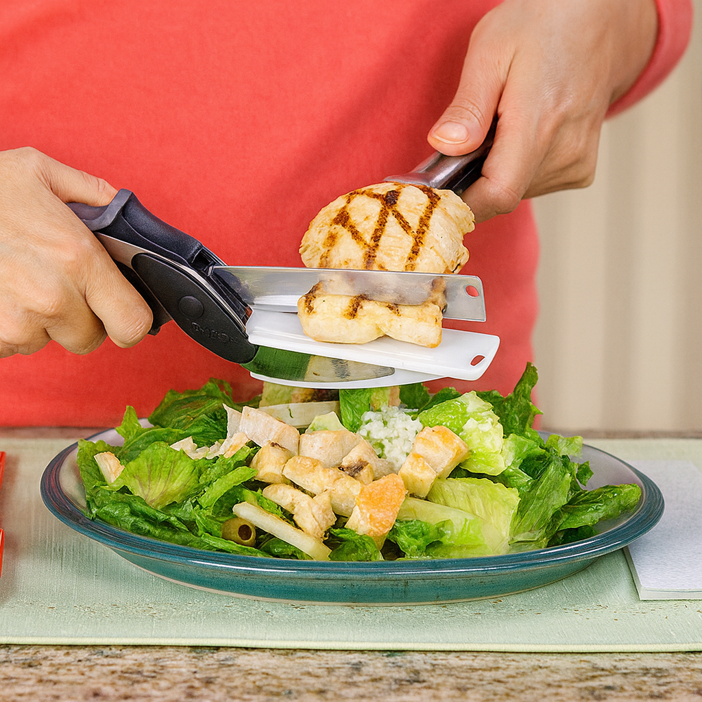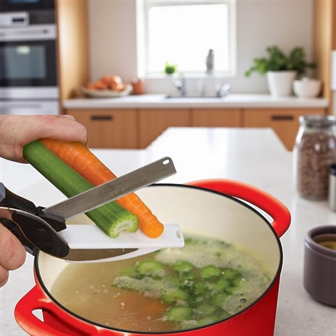 Foarfeca multifuncțională 2-în-1 este un gadget practic și inovator pentru bucătăria ta, care combină un cuțit din inox cu o mini-plăcuță de tocat, permițând tăierea rapidă și ușoară a alimentelor direct deasupra bolului, tigăii sau farfuriei. Ideală pentru legume, fructe, carne, brânzeturi și multe altele.