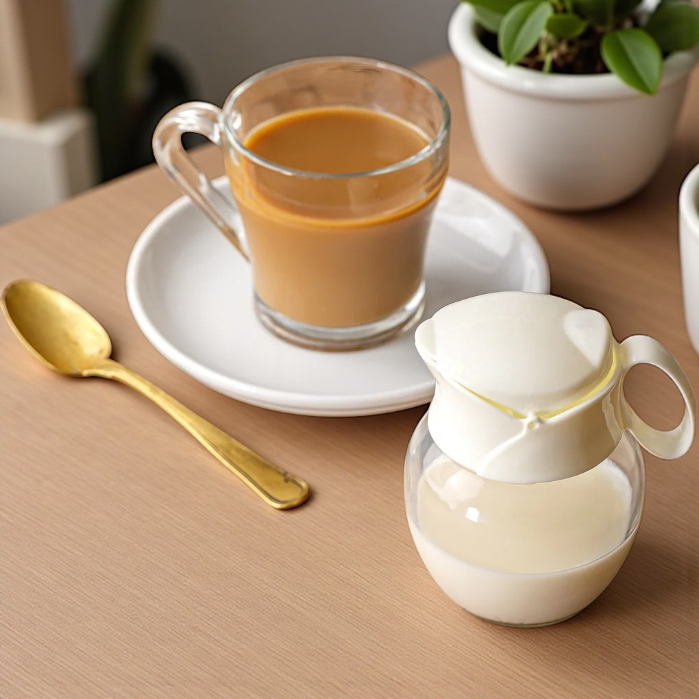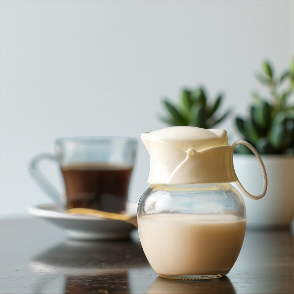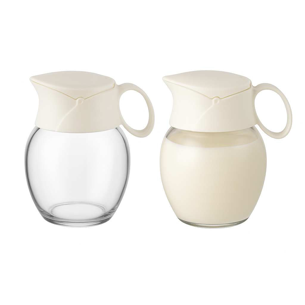 Recipient elegant din sticlă pentru lapte și frișcă, cu capac și mâner ergonomic. Ideal pentru servirea alături de cafea sau ceai. Ușor de curățat și practic.