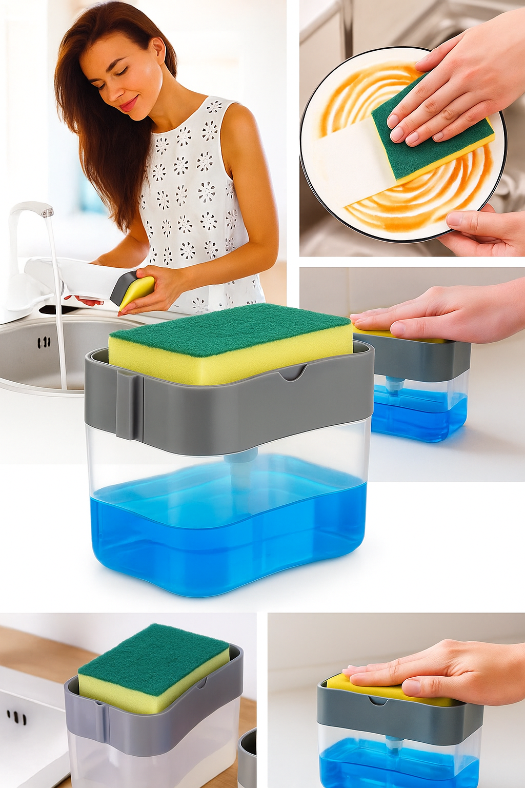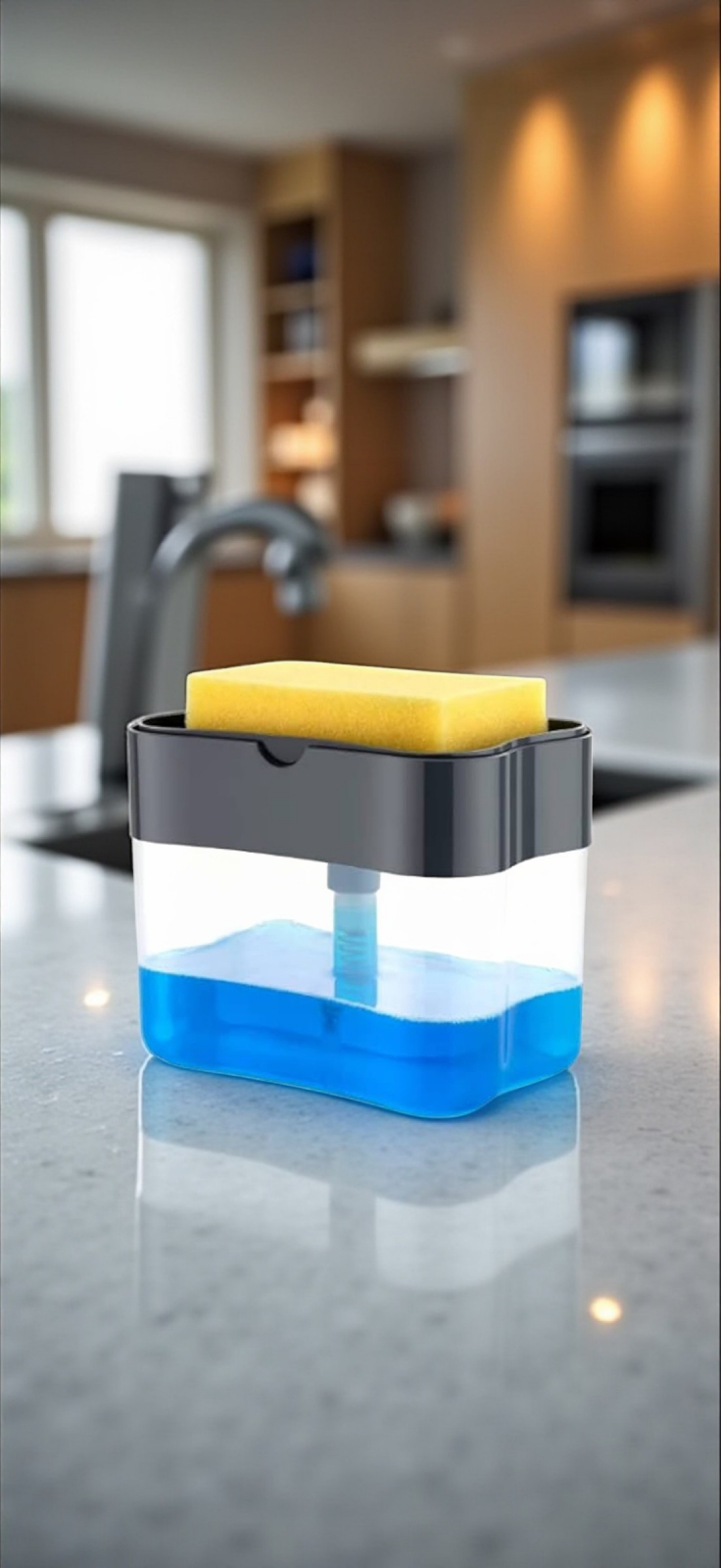 Ușurează-ți munca în bucătărie cu acest dozator inteligent 2 în 1, perfect pentru detergent lichid și suport pentru burete. Cu un simplu gest – o apăsare – obții cantitatea ideală de detergent direct pe burete, fără risipă și fără murdărie.