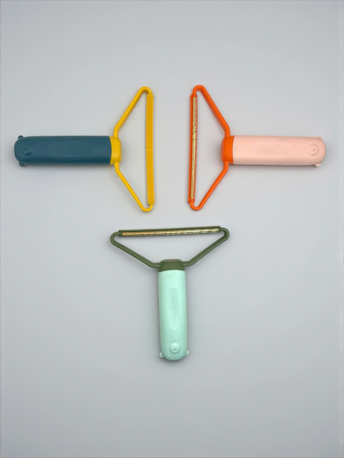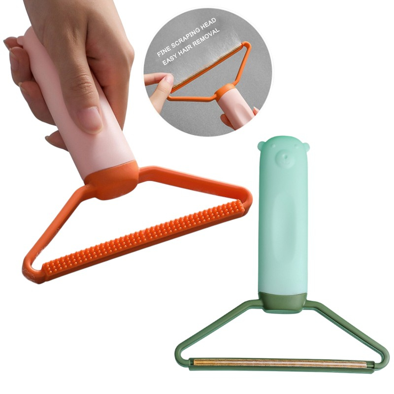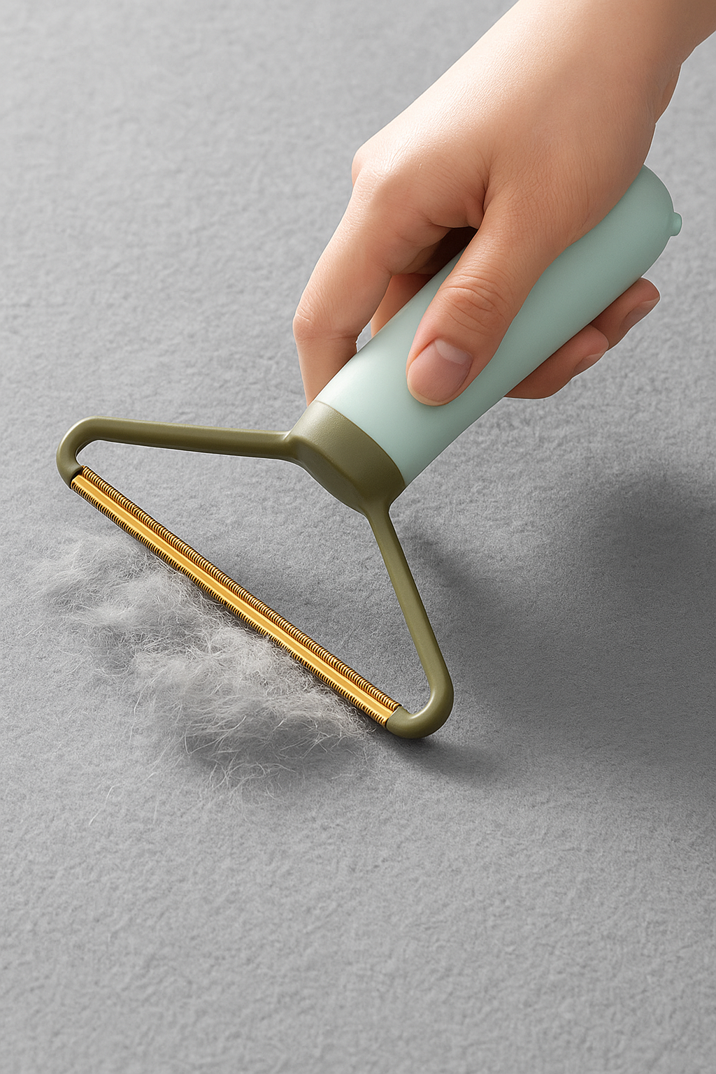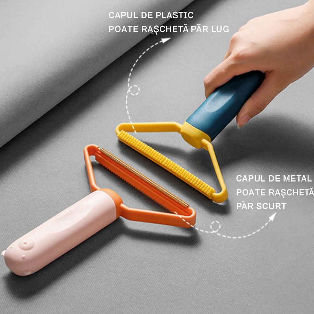 Perie eficientă pentru îndepărtarea părului de animale – cu cap metalic pentru părul scurt și cap din plastic pentru părul lung. Ușor de folosit, reutilizabilă și ideală pentru haine, canapele, covoare și textile.
