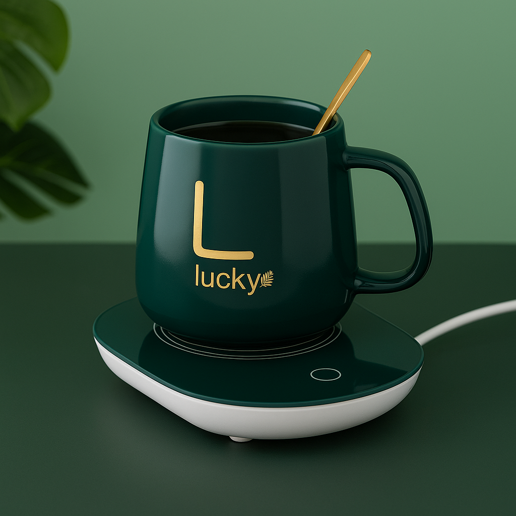 Set complet format din: cană ceramică de 400 ml, capac, linguriță și plăcuță electrică pentru menținerea temperaturii