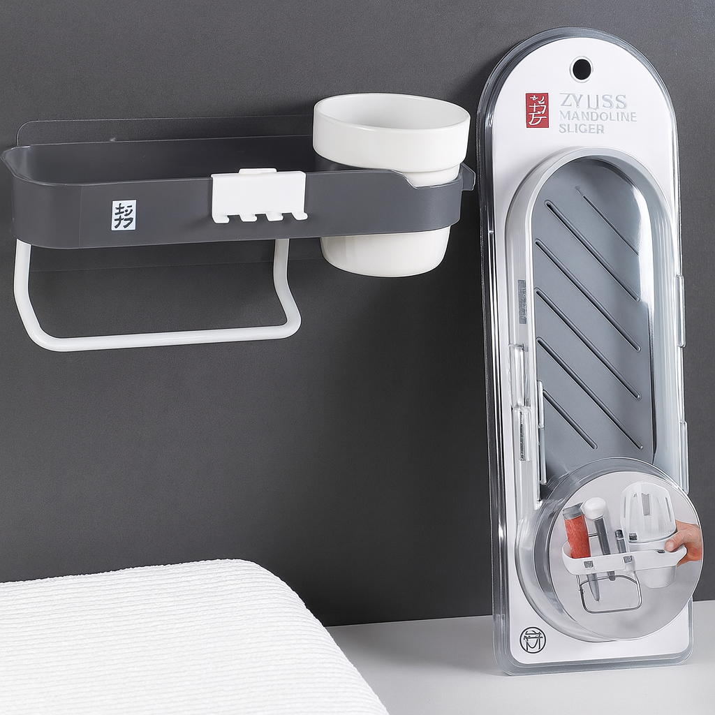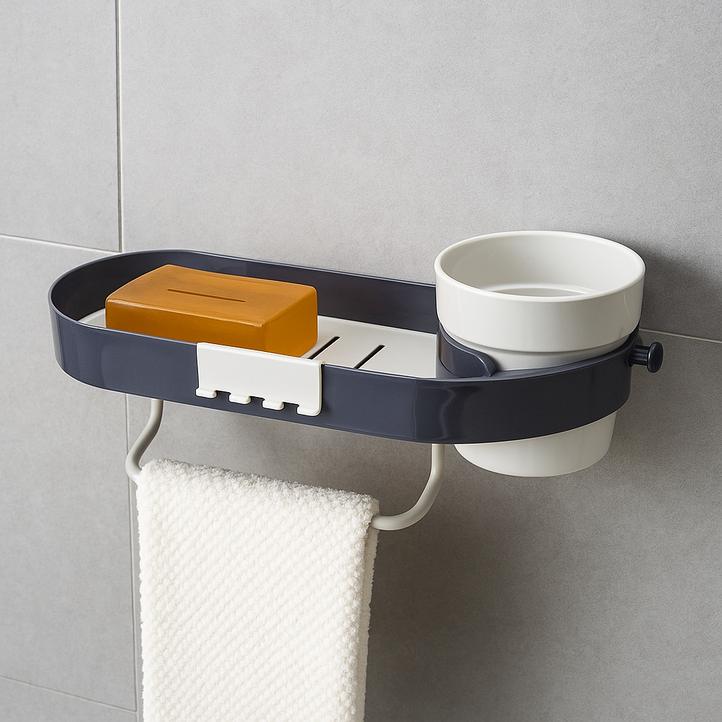 Organizează eficient spațiul din baie cu acest suport de perete multifuncțional! Include un recipient detașabil, bară pentru prosop și suport pentru săpun.