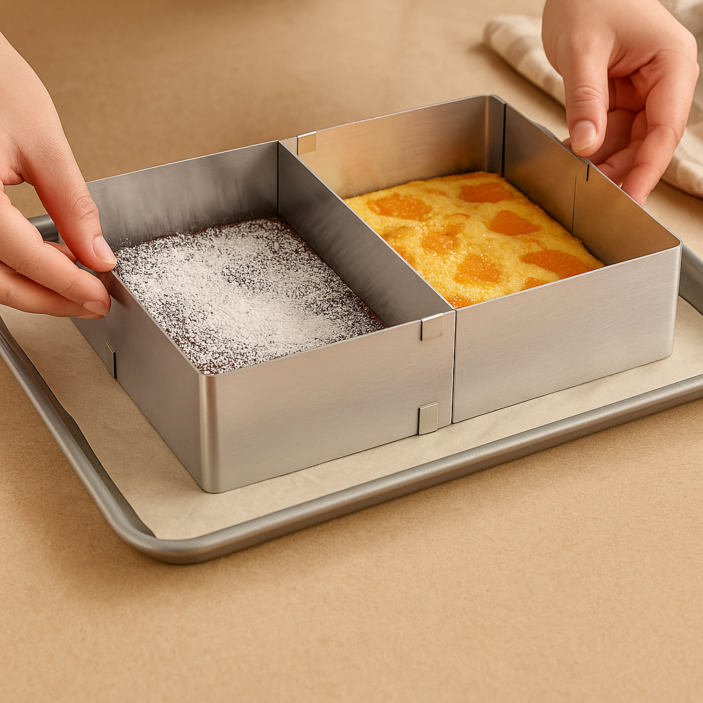 Această formă reglabilă din inox este alegerea ideală pentru gospodinele creative sau pasionații de patiserie. Datorită designului fără fund și separatorului inclus, poți coace simultan două tipuri de prăjituri sau blaturi diferite, fără să curgă compoziția.