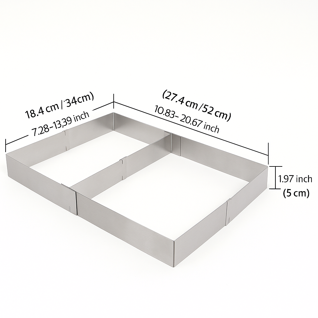 Formă reglabilă din inox pentru prăjituri și blaturi, cu separator detașabil. Ajustabilă 34–52 cm, fără fund, ideală pentru coacerea simultană a două deserturi.