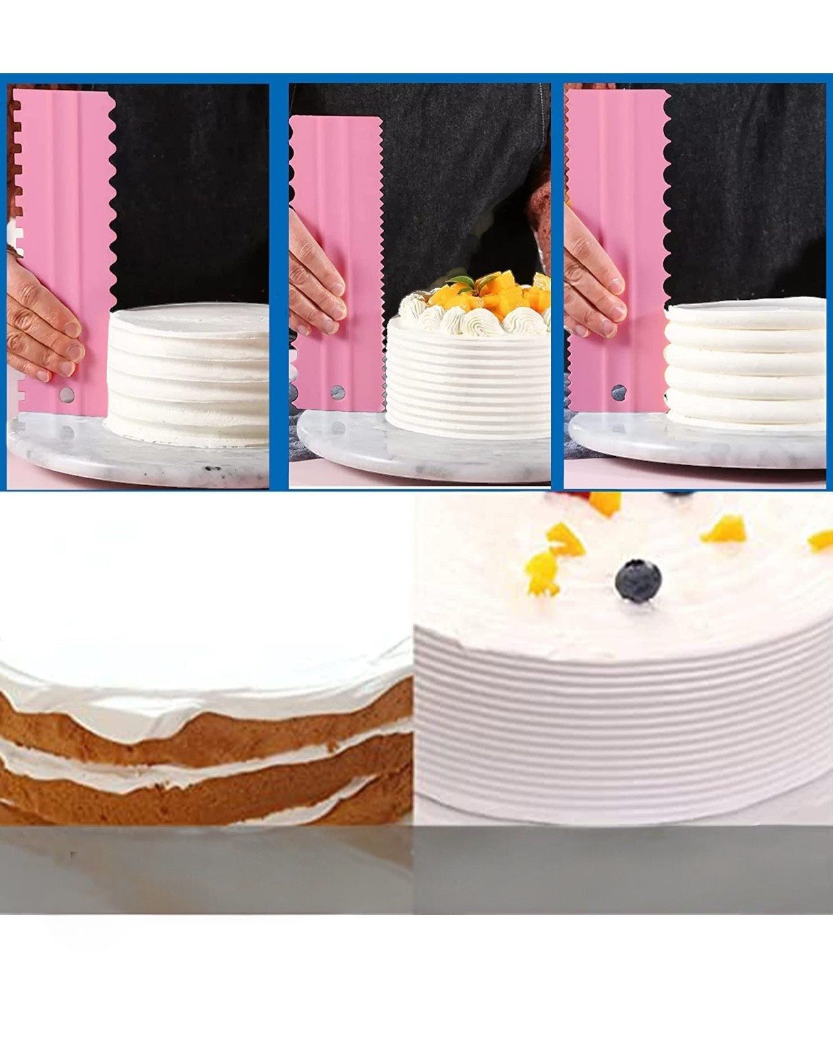 Setul conține 4 șabloane din plastic flexibil, special concepute pentru decorarea profesională a torturilor. Fiecare piesă are un model diferit (ondulat, zimțat, drept etc.), permițând realizarea de margini uniforme și estetice cu ușurință.
