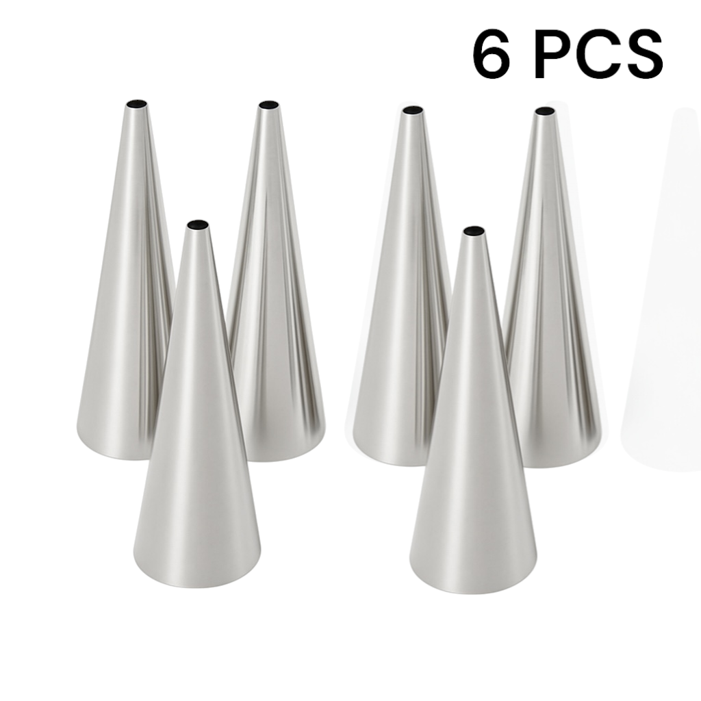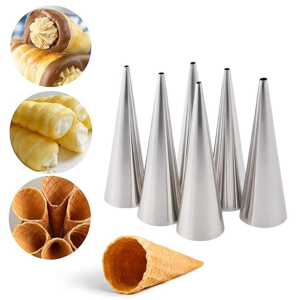 Creează rapid și uniform cornete delicioase cu ajutorul acestui set de 6 forme conice din inox! Perfecte pentru deserturi umplute cu cremă, pateuri sărate sau chiar cornete de înghețată din aluat.