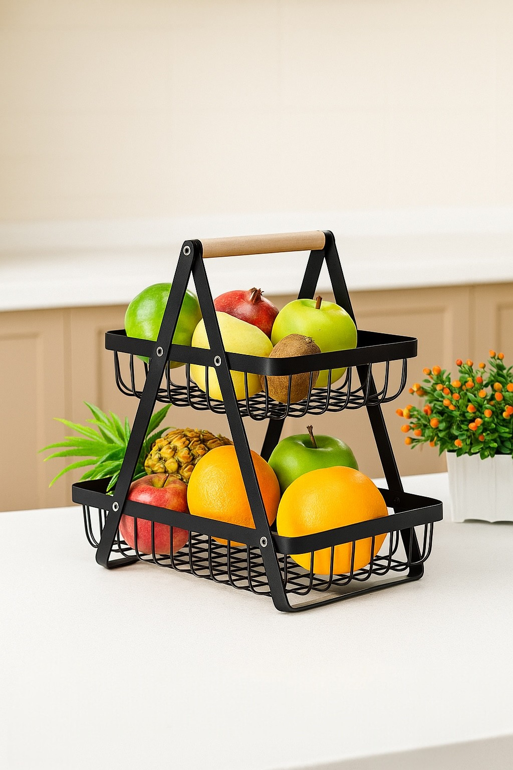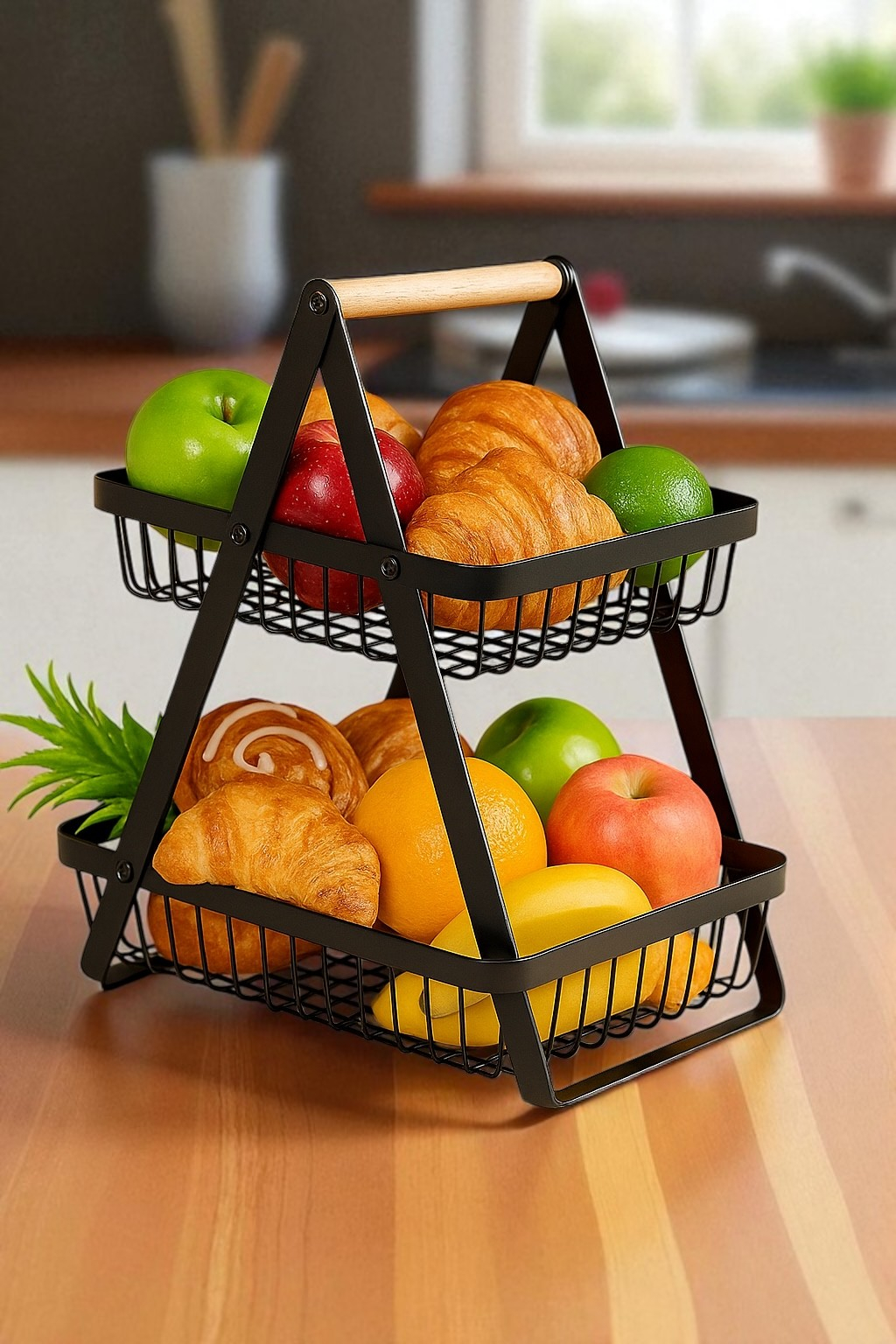 Adaugă un plus de stil și funcționalitate mesei sau bucătăriei tale cu această etajeră metalică pe două nivele, prevăzută cu un mâner din lemn elegant și practic. Cu un design modern în formă de triunghi, etajera este perfectă pentru depozitarea și servirea fructelor, pâinii sau produselor de patiserie, dar și ca element decorativ versatil.