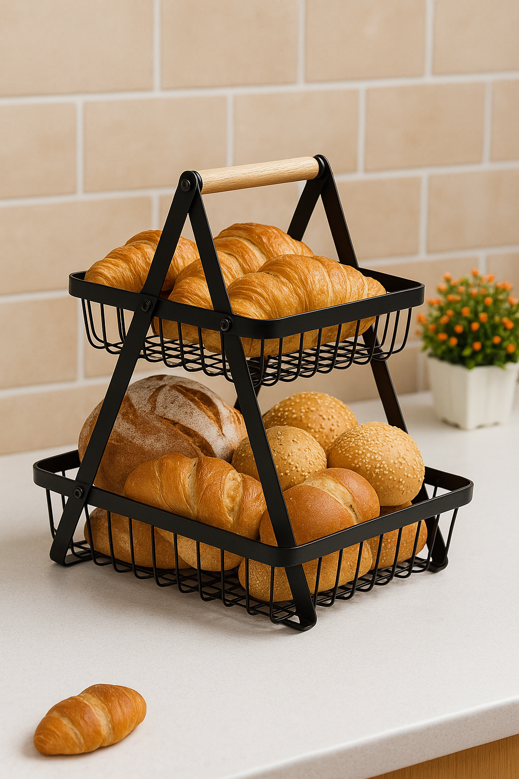 ✔ Două coșuri spațioase – ideale pentru fructe, chifle, croissante, pâine sau gustări