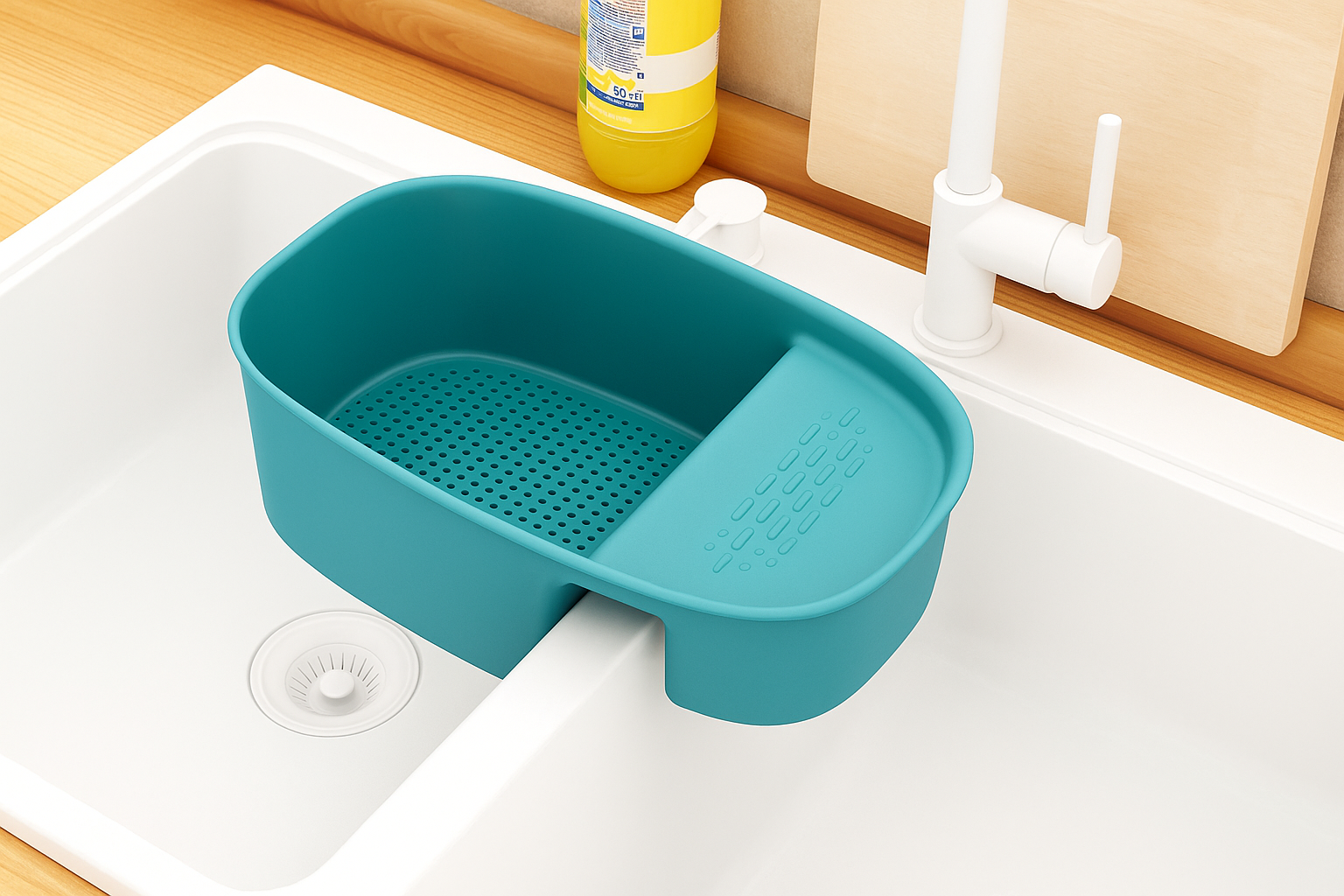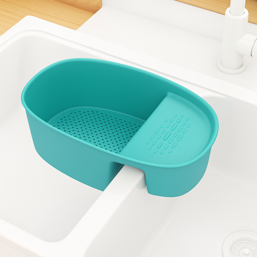 Partea perforată permite clătirea și scurgerea rapidă a pastelor, fructelor sau legumelor, în timp ce compartimentul lateral menține la îndemână accesoriile de curățenie. Ideal pentru bucătării moderne, mici sau mari, unde fiecare centimetru contează.