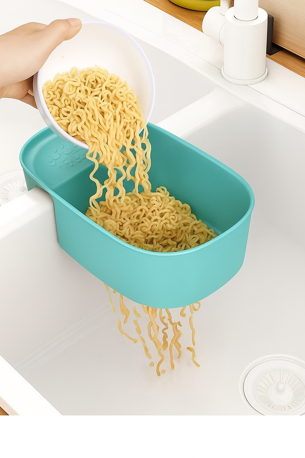 Organizator chiuvetă 2 în 1 cu sită de scurgere și suport lateral – ideal pentru legume, paste și ustensile