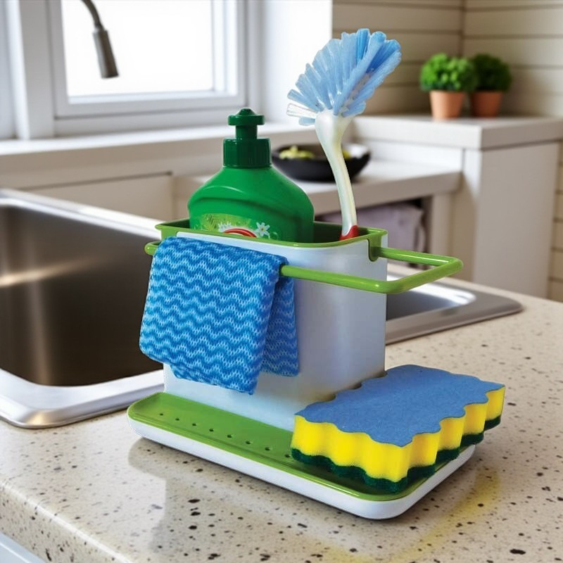 Adaugă funcționalitate și ordine spațiului tău de lucru din bucătărie cu acest organizator pentru chiuvetă, alb-verde, ideal pentru a menține ustensilele de curățenie la îndemână și bine organizate.