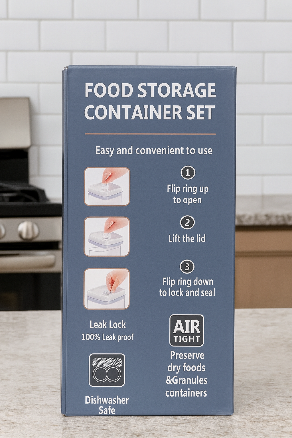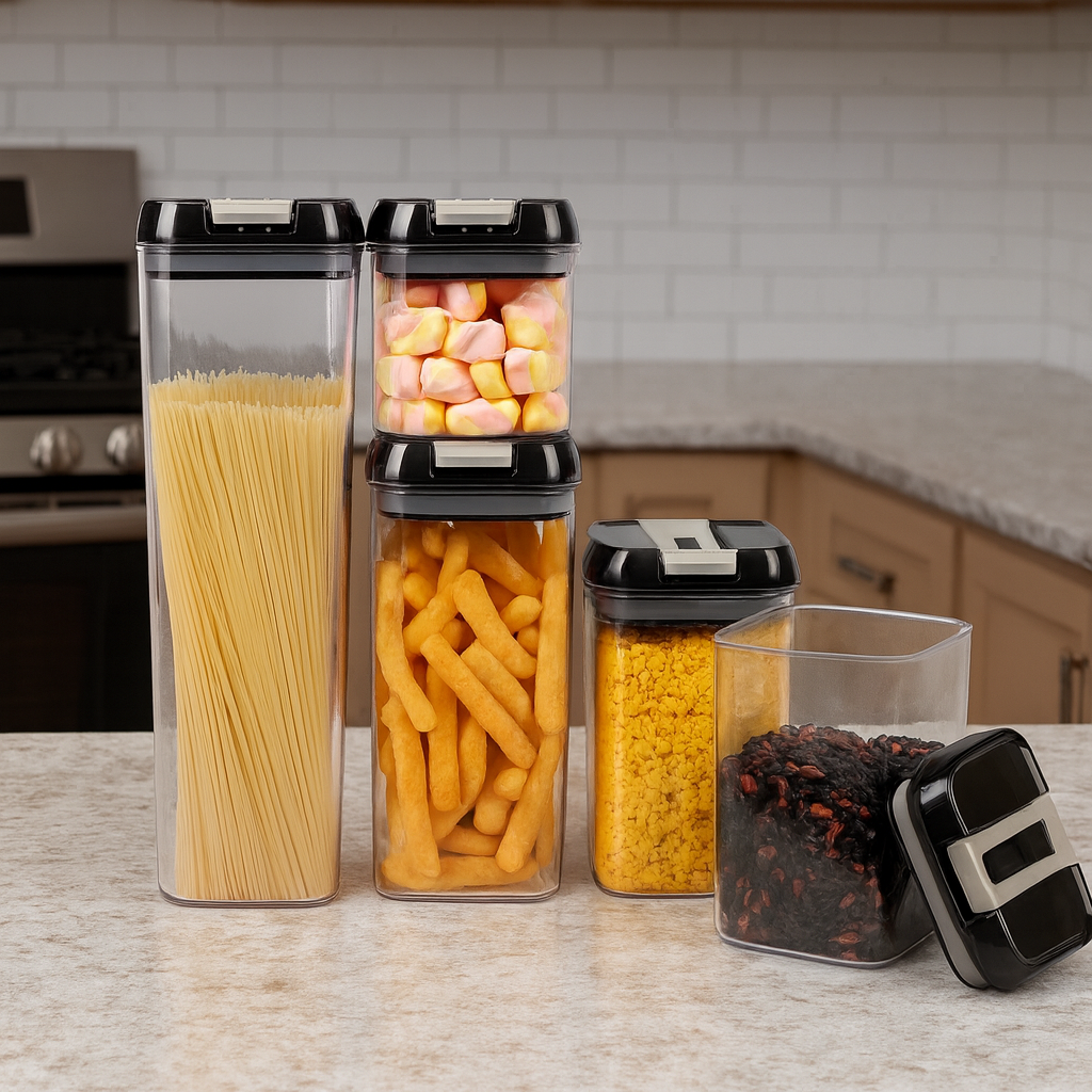 Set 5 recipiente etanșe cu capac flip-ring – păstrează alimentele proaspete și organizează eficient bucătăria. Diverse dimensiuni, design transparent și stivuibil, ideale pentru cereale, paste, făină sau snacksuri.