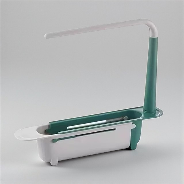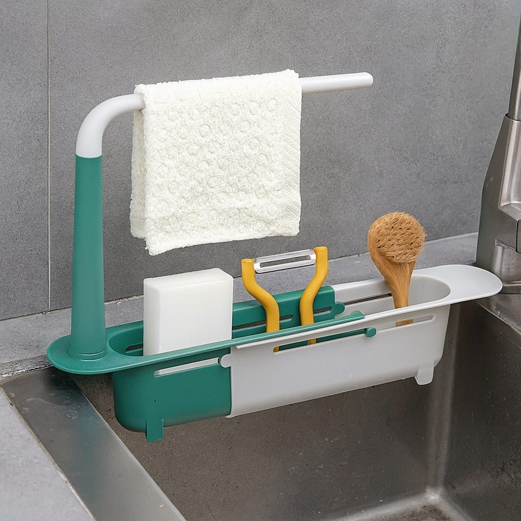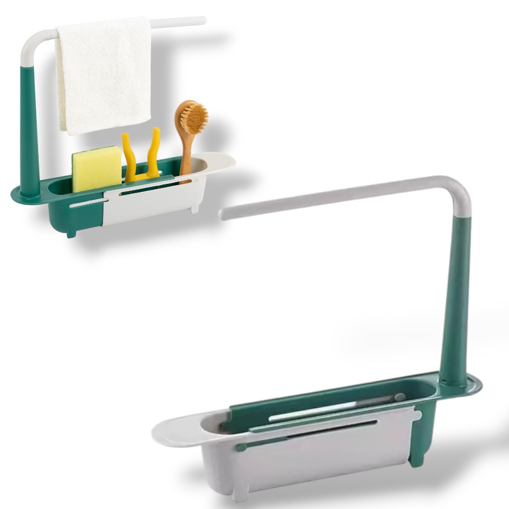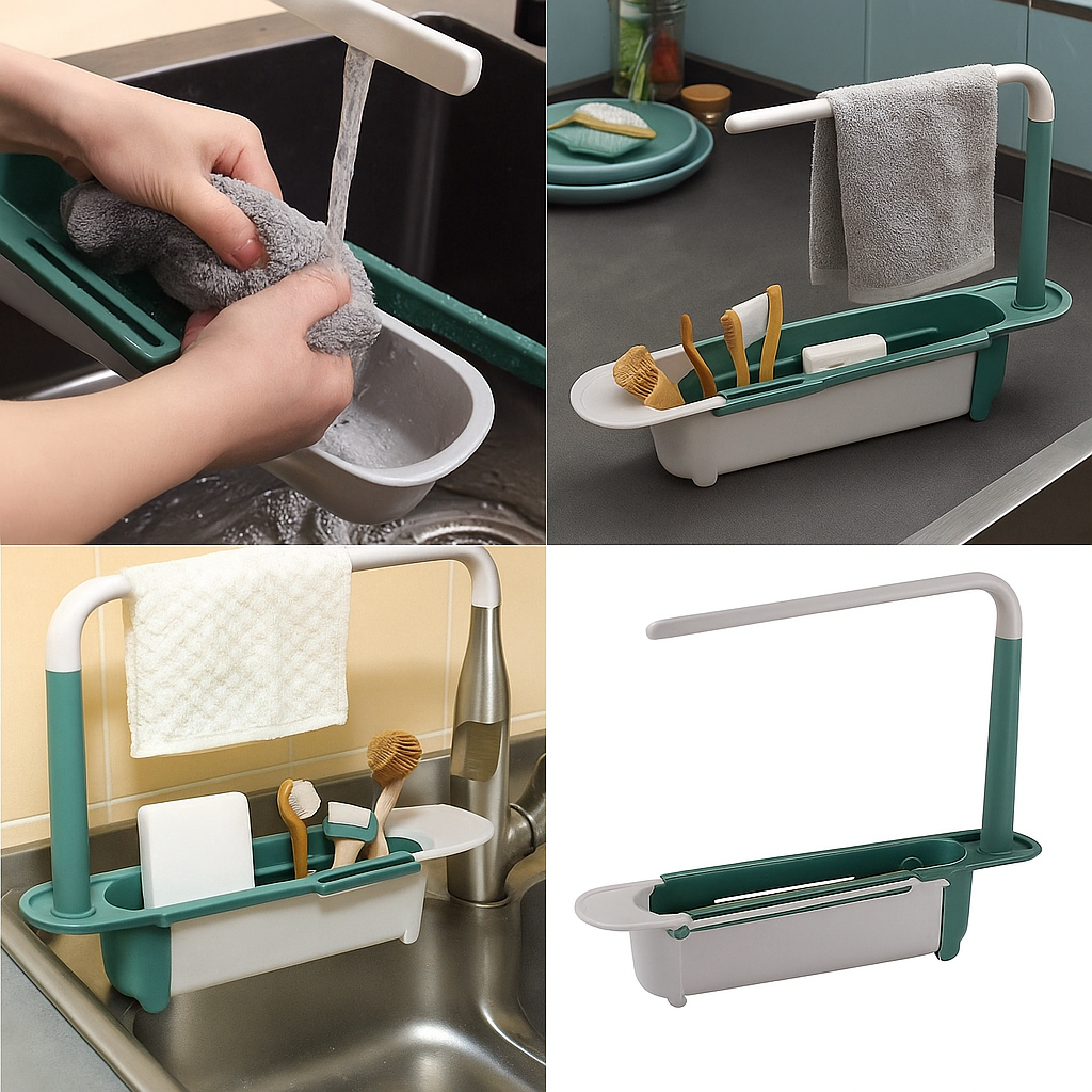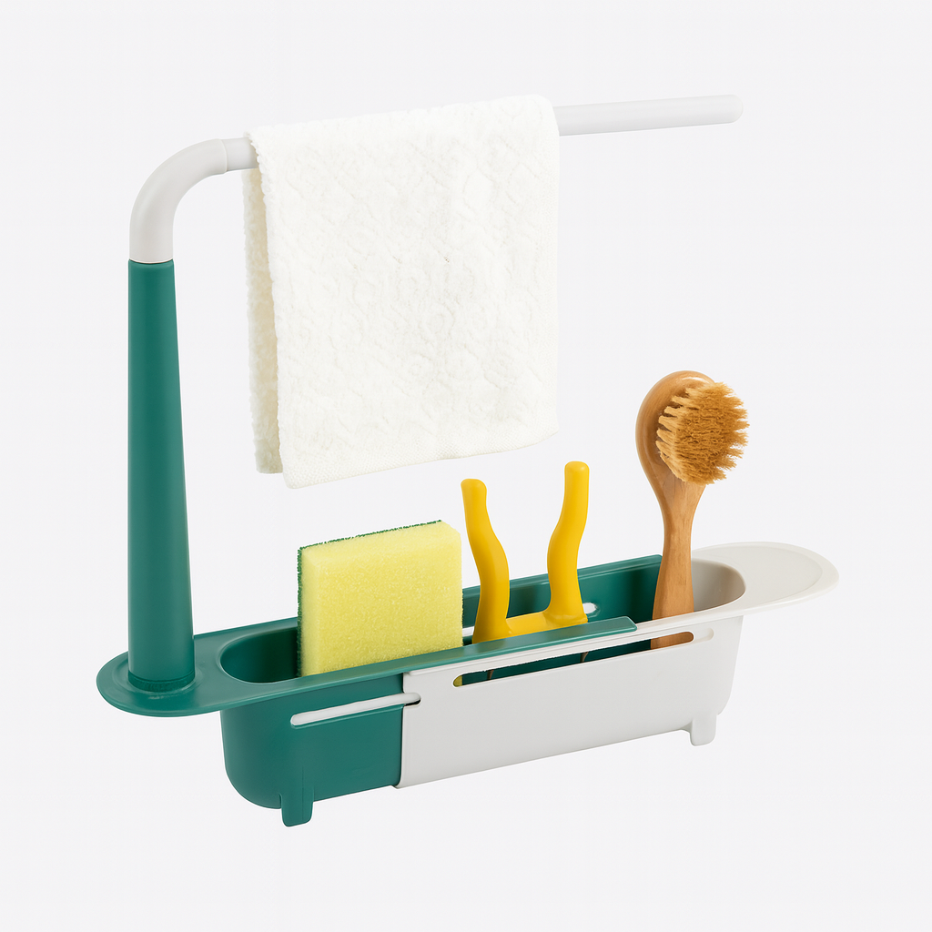 Suport extensibil pentru chiuvetă, ideal pentru organizarea lavetei, bureților și accesoriilor de curățenie. Design inteligent cu bară pentru prosop și sistem de scurgere integrat.