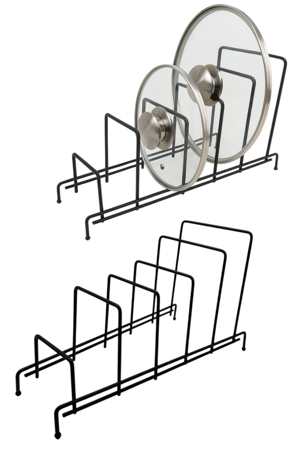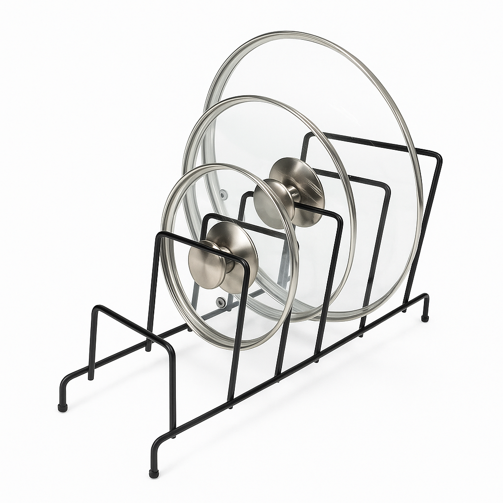 Suport metalic pentru capace și tăvi, cu 5 compartimente. Rezistent, compact și practic – ideal pentru organizarea bucătăriei tale.