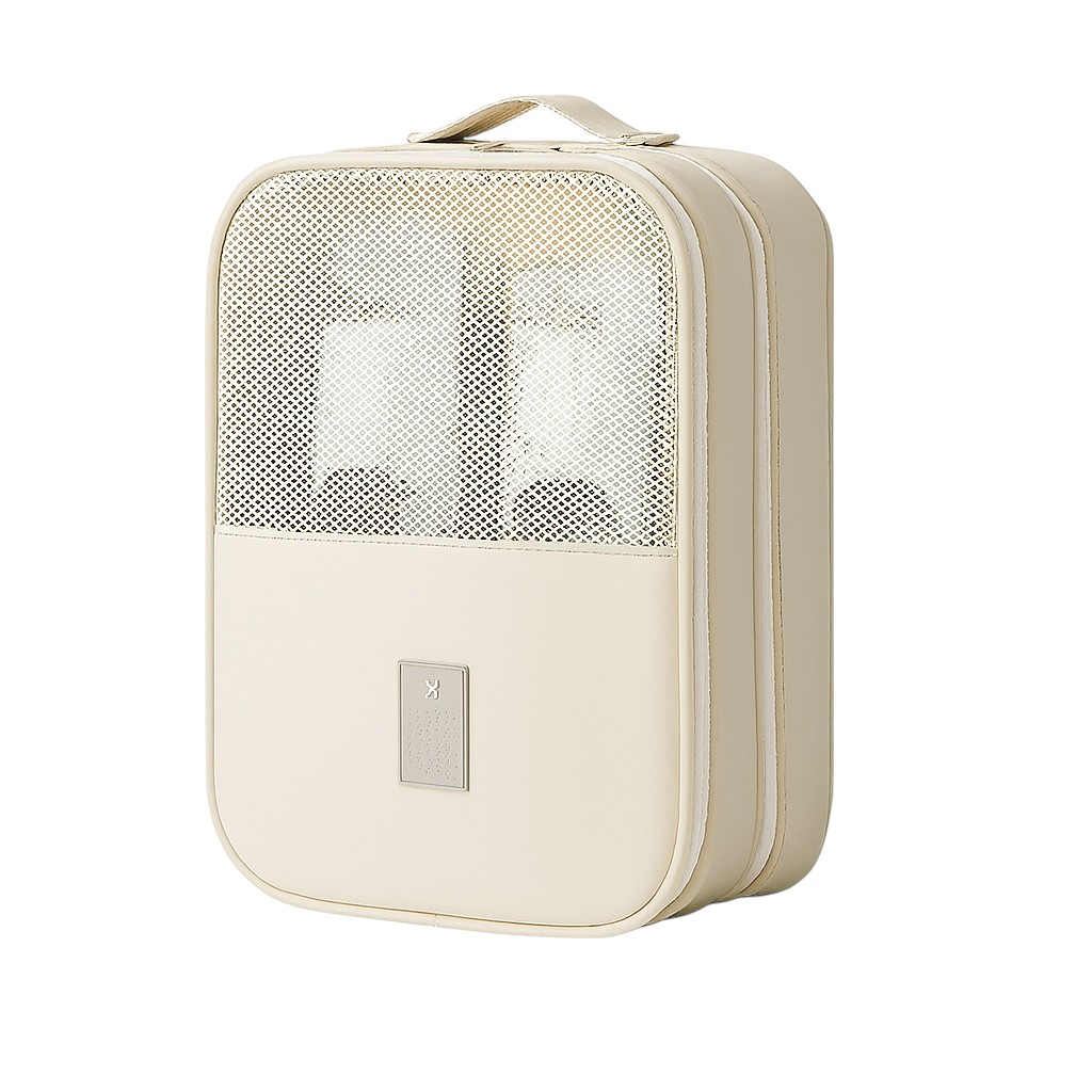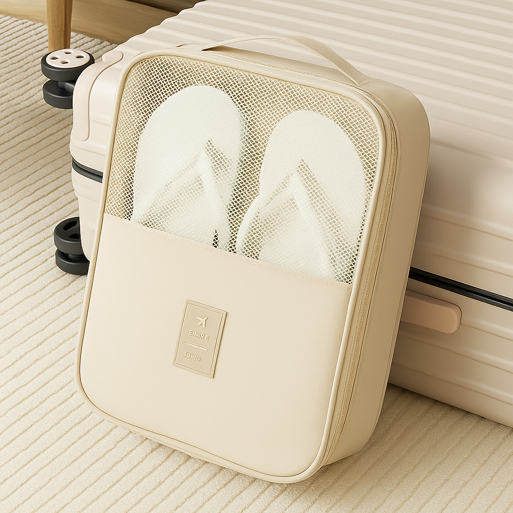 Husă de voiaj crem, practică și elegantă, cu 3 compartimente pentru până la 3 perechi de încălțăminte. Material textil rezistent, fermoar dublu, mâner pentru transport și plasă pentru ventilație.